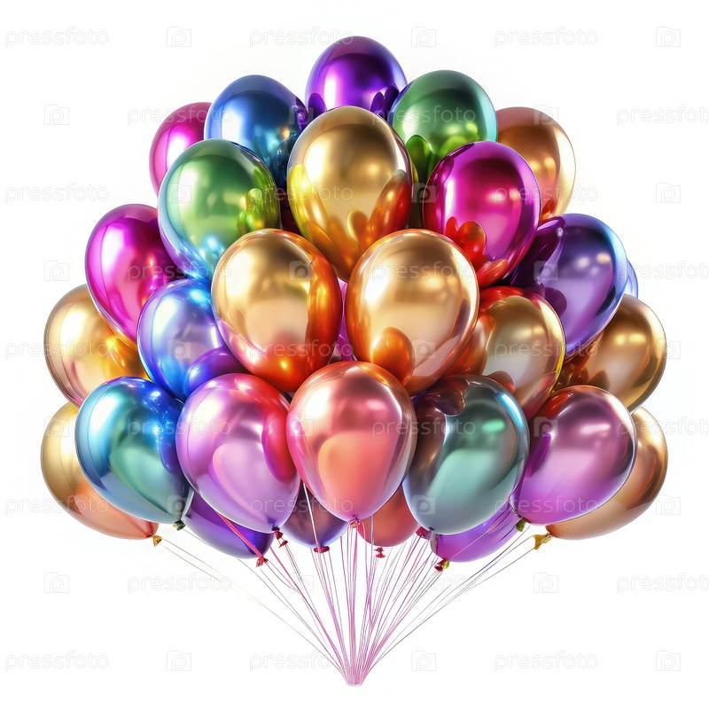 Яркий букет красочных блестящих воздушных шаров, грациозно плавающих на чистом белом фоне, идеально подходит для празднований и специальных случаев