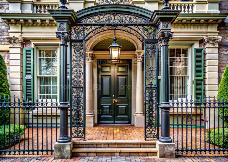 Элегантный колониальный вход с сложной чугунной рамой и пышной зеленью в живописном жилом районе