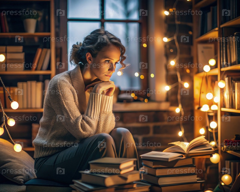 Человек сидит в уютной комнате, окруженной книгами, глубоко размышляет и готовит извинения во время тихого зимнего вечера