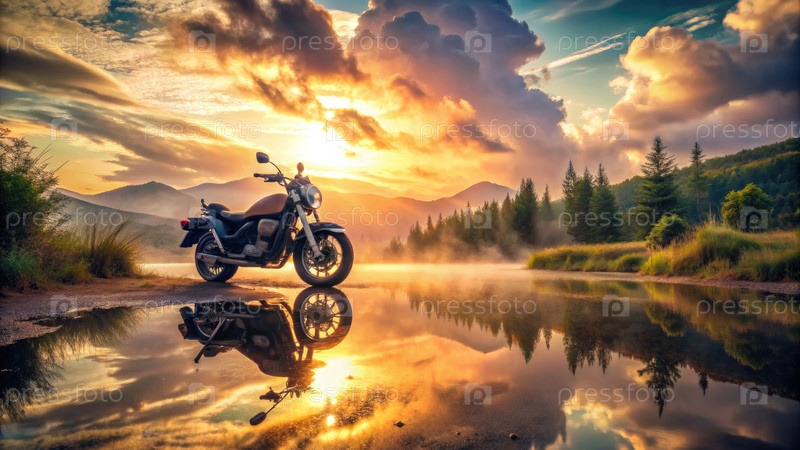 Потрясающий закат солнца над отражением мотоцикла у Тихого озера в горах