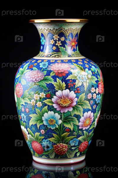 Изысканная древняя китайская керамическая ваза, украшенная сложными цветочными узорами на темном фоне, демонстрирует яркие цвета и мастерство
