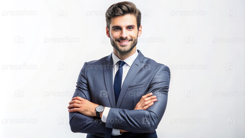 Молодой бизнесмен уверенно позирует с перекрещенными руками в профессиональной обстановке