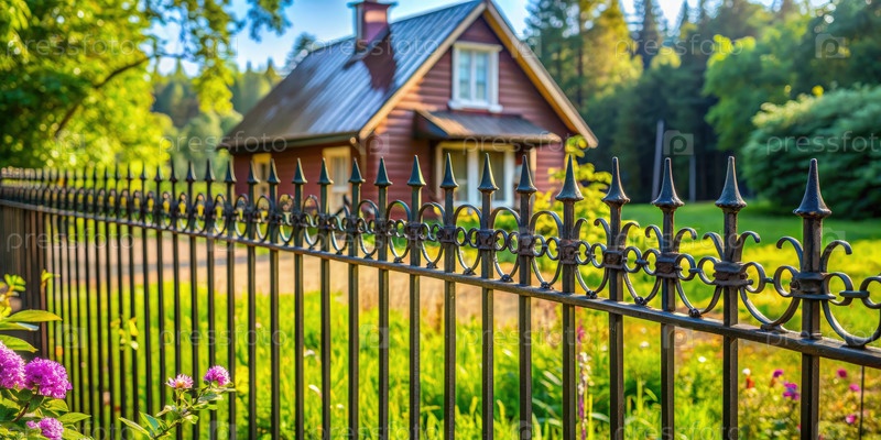 Декоративный металлический забор, окружающий сад коттеджера в спокойной лесистой местности днем
