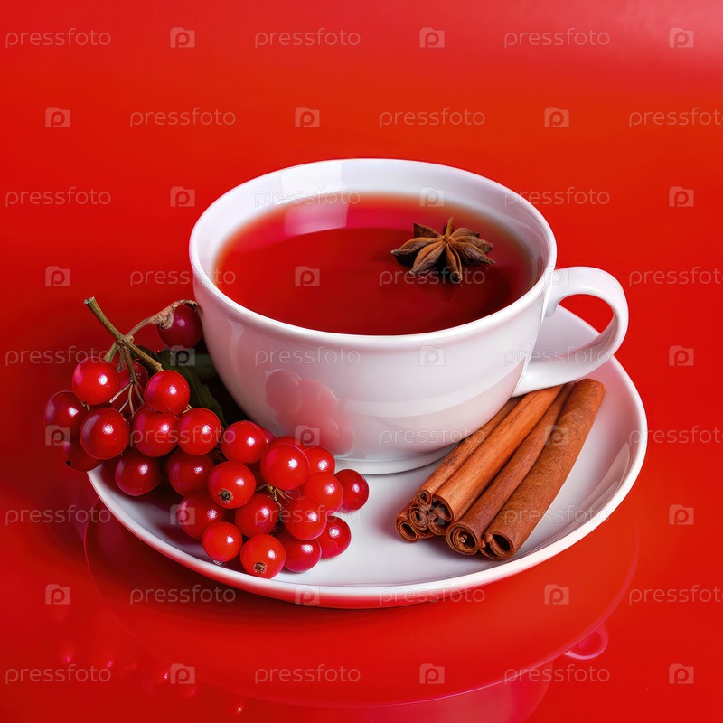 Наслаждаясь чашечкой черного чая с красными ягодами и специями на ярко-красном столе