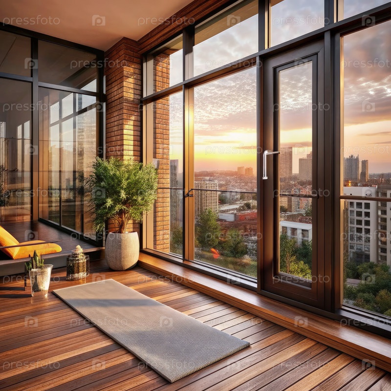 Минималистический остекленный балкон на закате с матом для йоги и видом на город