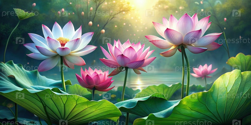Элегантное расположение красочных цветов лотоса, грациозно цветящих в безмятежном водном саду во время золотого часа раннего вечера
