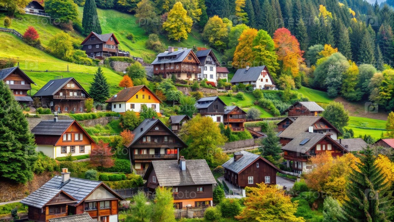 Очаровательная деревня, расположенная среди ярких деревьев осенью