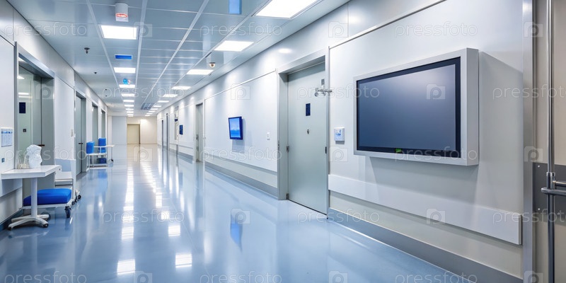 Пустая цифровая доска вдоль коридора больницы с ярким освещением и современным дизайном