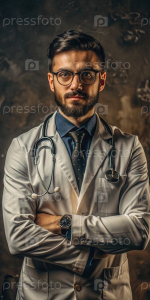 Врач в лабораторном халате уверенно позирует со стетоскопом в клинической обстановке