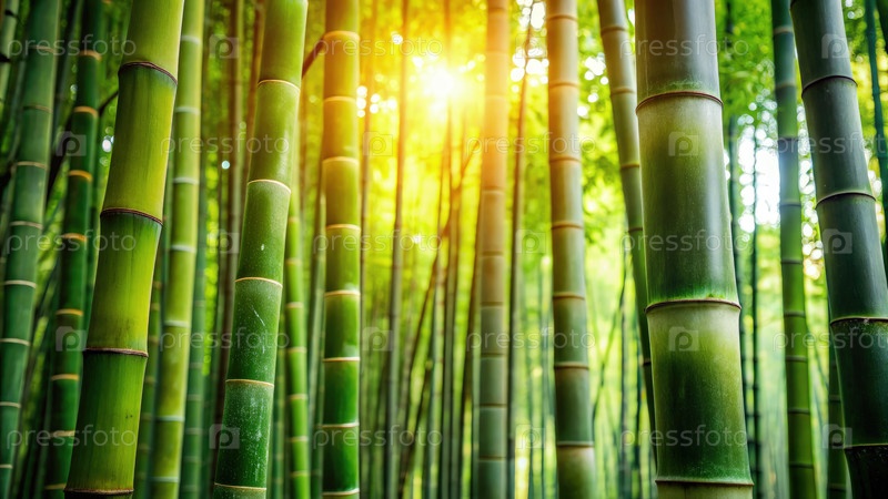 Близкий вид бамбуковых стеблей, освещенных солнечным светом в спокойной лесной обстановке