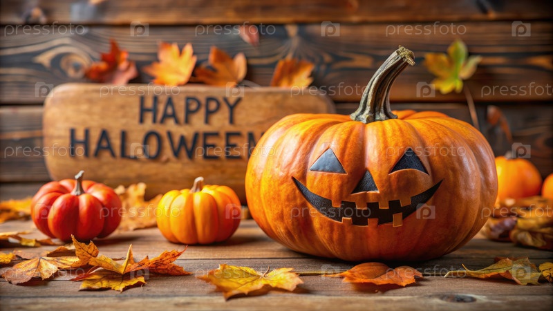 Близкий взгляд на счастливый Джек О'Лантерн, окруженный осенними листьями в день Хэллоуина