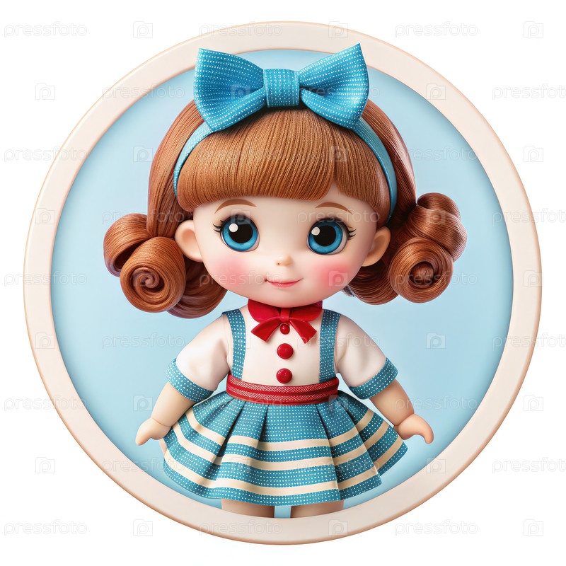 Маскот куклы Одри в сине-белом платье на простом фоне