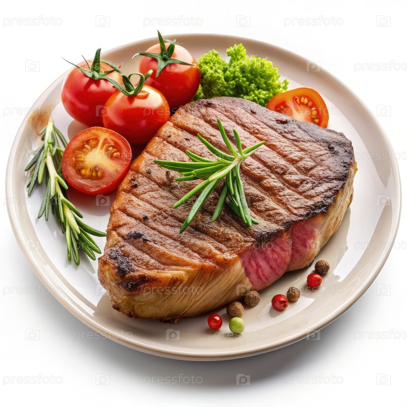 Идеально обжаренный стейк, подаваемый с свежими помидорами и травами на тарелке