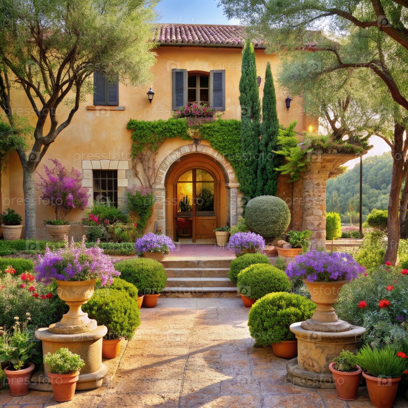 Спокойный средиземноморский сад с яркими цветами на закате в тихом убежище