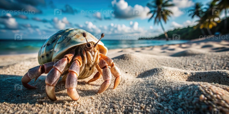 Краб-отшельник исследует песчаный пляж во время яркого тропического заката