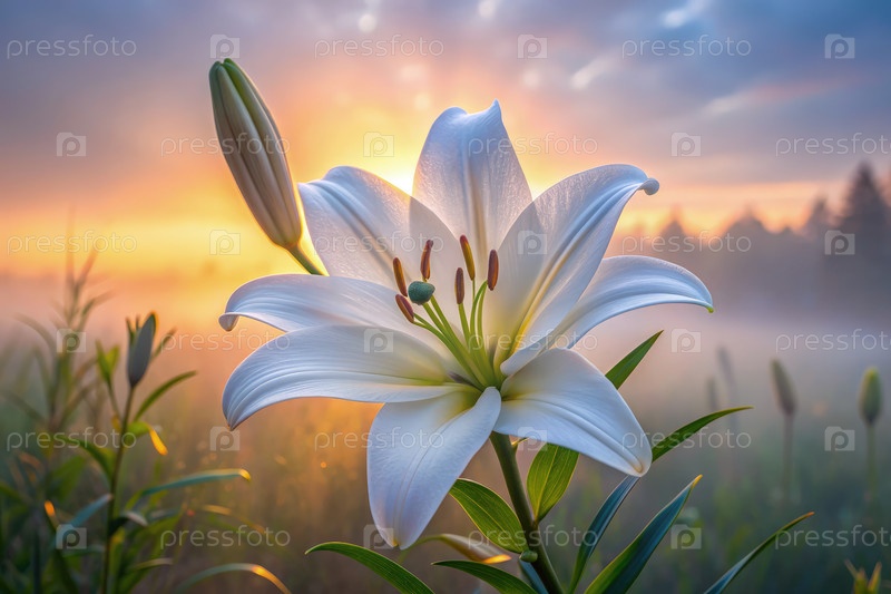 Белая лилия в туманном поле на восходе солнца, сфотографированная макрообъективным объективом