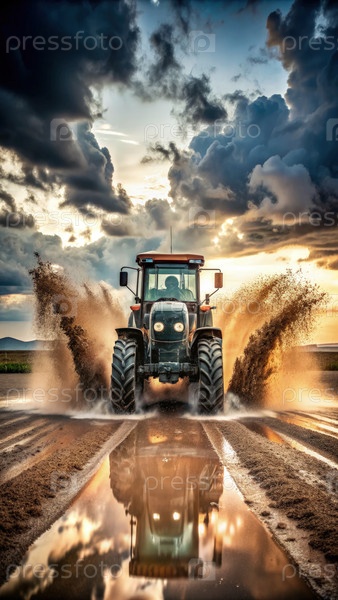 Высокоскоростной снимок трактора, который ворует в грязи при закате солнца
