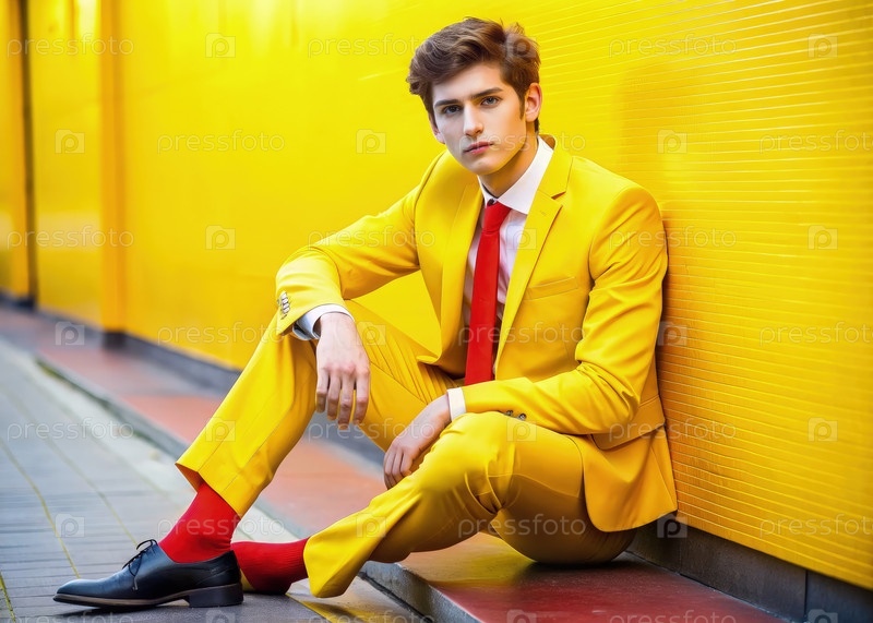 Молодой человек в желтом костюме и красном галстуке позирует на яркой желтой стене