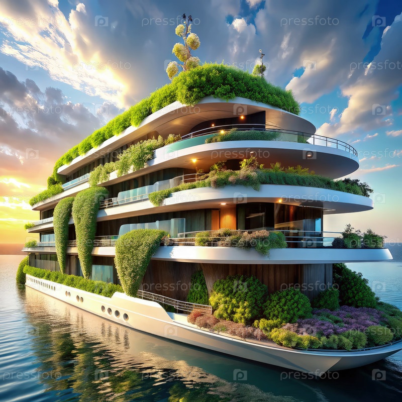 Роскошная яхта с вертикальными садами, плавающая на закате
