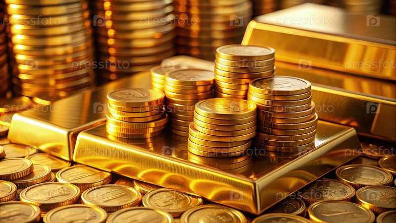Золотые монеты и слитки, сложенные на стандартной шкале в финансовом учреждении