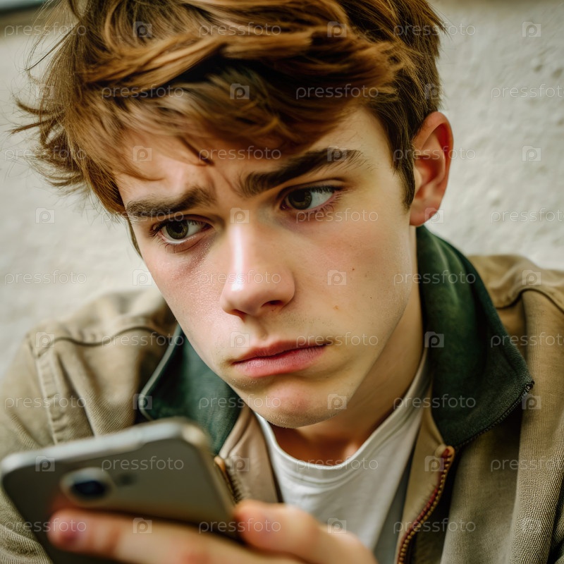 Молодой человек сосредоточен на мобильном телефоне, в течение дня выглядит обеспокоенным внутри