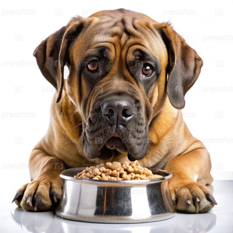 Мастиф-собака наслаждается едой из своей миски в светлой помещенной обстановке