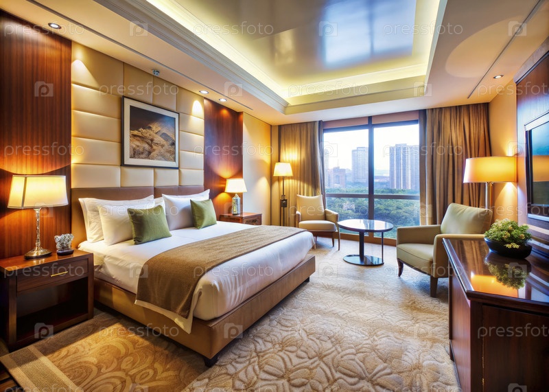 Комфортный гостиничный номер с современным декором и видом на город при закате