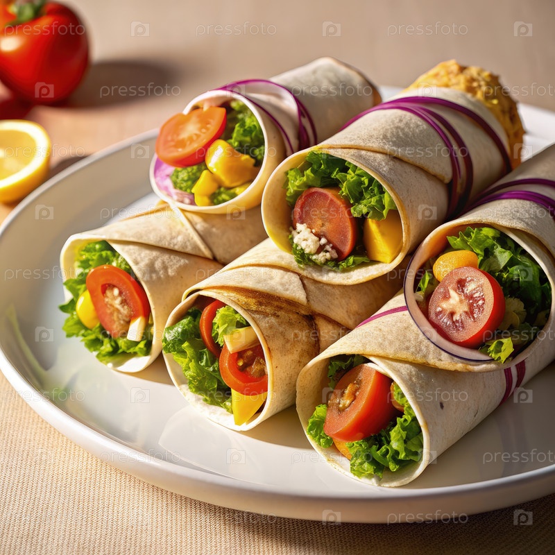 Рулоны лаваши, заполненные свежими овощами и травами на обеденном столе