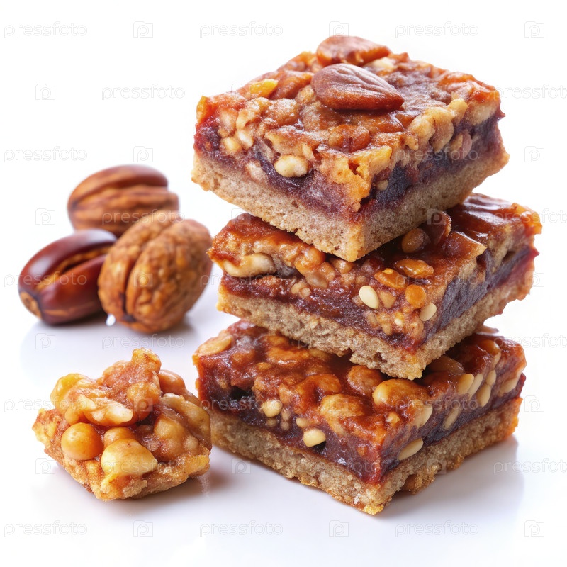 Сладкие ореховые и даточные батончики, сложенные на белом фоне