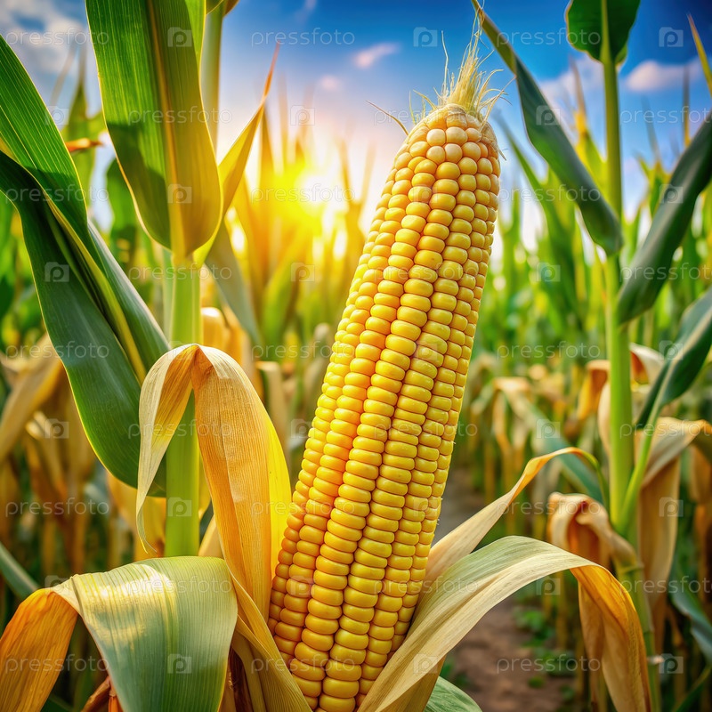 Золотое кукурузное ухо, блестящее на солнце на фоне пышно-зеленого кукурузного поля во время солнечного дня в конце лета
