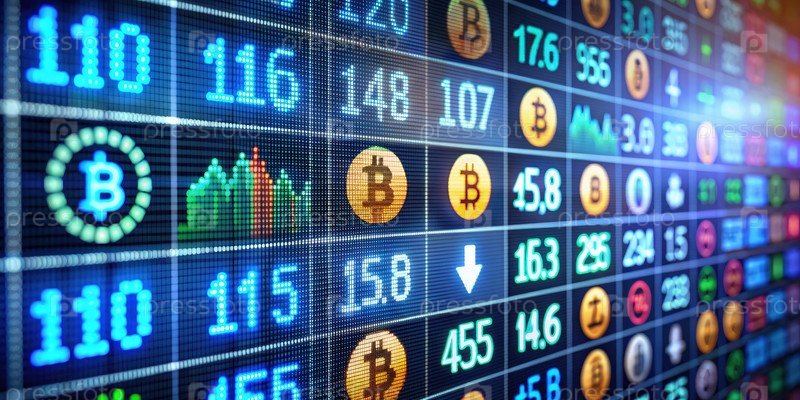 Цифровой экран, отображающий стоимость криптовалюты и рыночные тенденции в торговом центре днем