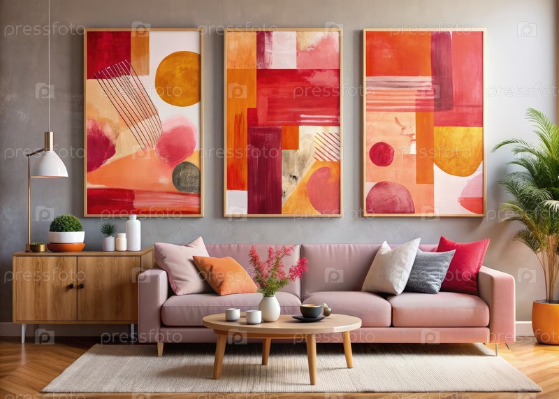 Современное абстрактное стеновое искусство с геометрическими формами в уютной обстановке гостиной