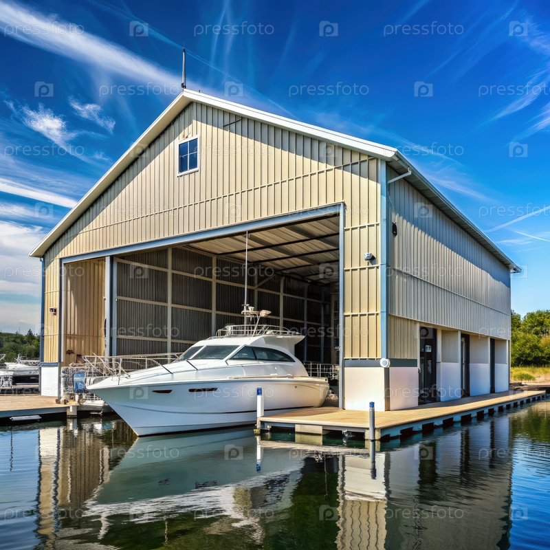 Внешний вид яхт-ремонтного хангара с лодкой, пришвартованной на спокойных водах