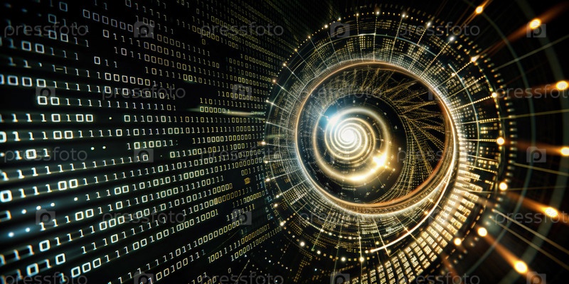 Визуальное представление числа π, окруженного двоичным кодом в спиральном рисунке