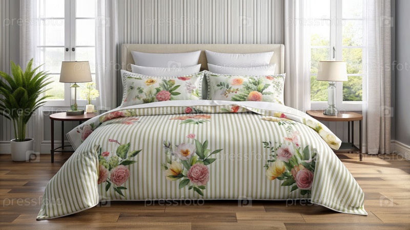 Элегантная спальня с современным тканевым постельным набором и белыми полосатыми цветочными комфортами в ярком естественном свете
