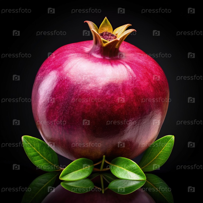 Ярко-фиолетовый гранат с зеленым листом на твердом черном фоне при закате