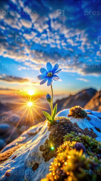 Синий цветок расцветает на скалистой горе при закате с яркими облаками