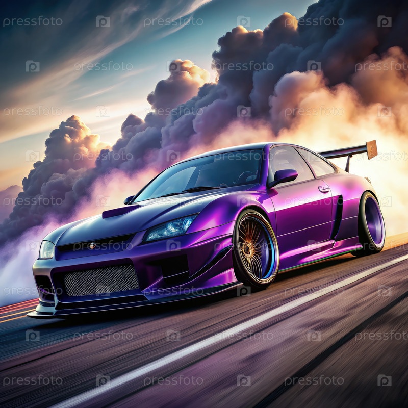 Увлекательная демонстрация черно-фиолетового настроенного гоночного автомобиля в движении на закате