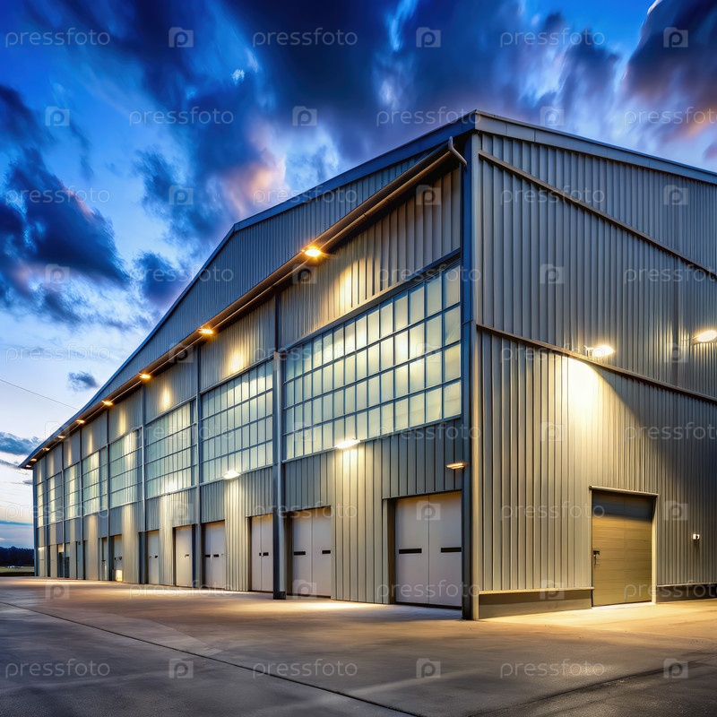 Внешний вид промышленных ангаров под драматическим облачным небом на закате