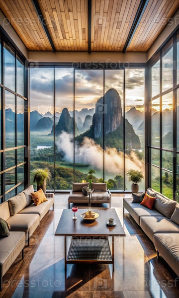 Роскошная гостиная с панорамным видом на горы при закате, оснащенная современной мебелью и природными элементами