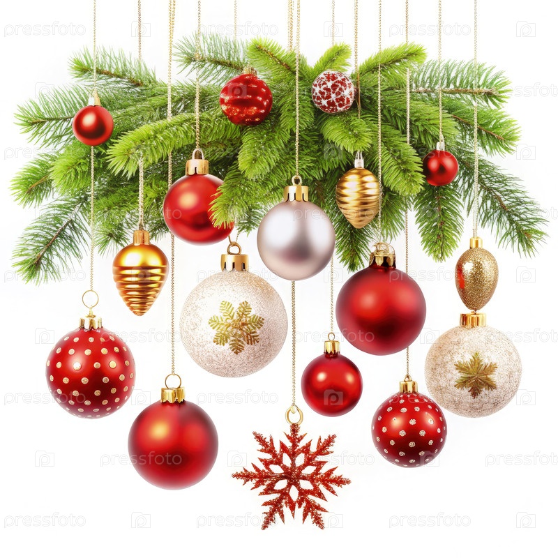 Праздничные рождественские украшения с красочными орнаментами и зелеными сосновыми ветвями, висящими на белом фоне для праздничных торжеств