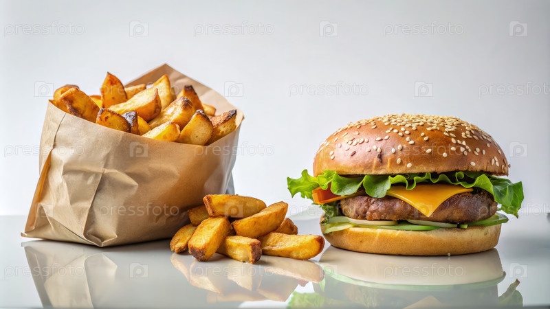 Сочный гамбургер, подаваемый с хрустящими жареными картофелями в непринужденной столовой