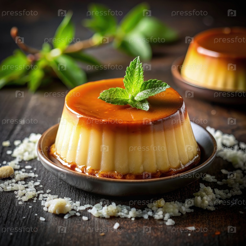 Отличный десерт Flan De Coco с богатым карамельным покрытием, окруженный травами и натуральными ингредиентами