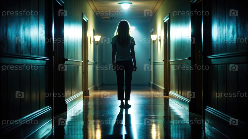 Теневая фигура, стоящая одна в тускло освещенном коридоре ночью