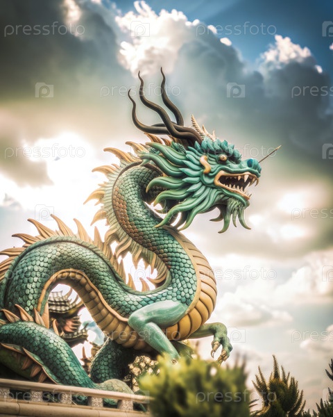 Туркуазная статуя китайского дракона на облачном небе в дневное время