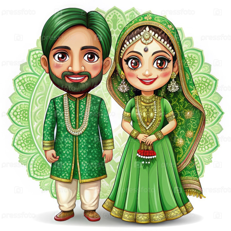Изумленная карикатура на мехнди невесты и жениха в традиционной одежде