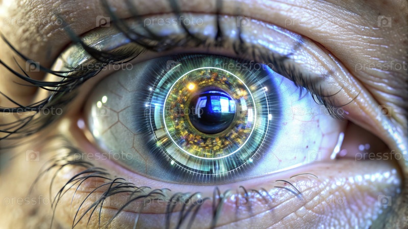 Ближайший снимок глаза с помощью цифровых отражений, демонстрирующих сложные детали и яркие цвета в футуристической обстановке