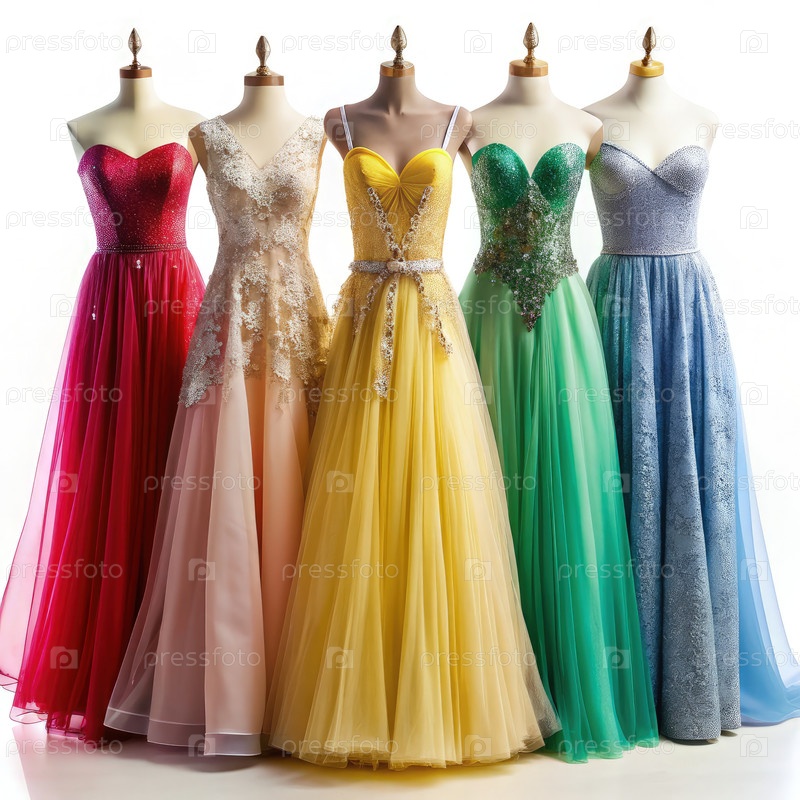 Элегантный бутик по прокату платьев, демонстрирующий множество изысканных вечерних платьев на манекенах в шикарной обстановке
