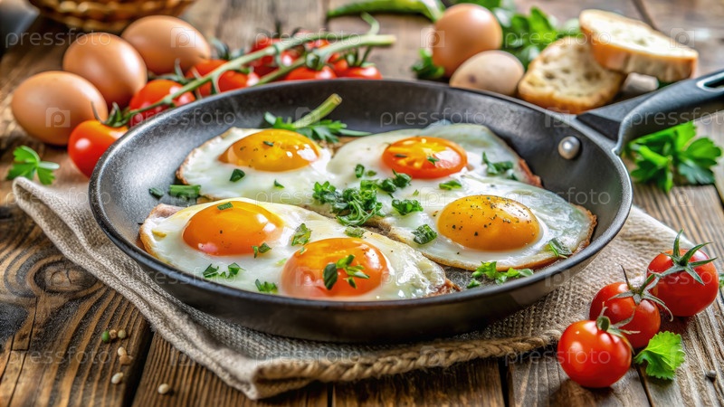 Вкусно приготовленные жареные яйца подаются в сковороде со свежими ингредиентами на деревянном рустическом столе