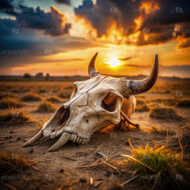 Зрительный взгляд на закат солнца на обветренный коровьи череп, встроенный драматическими облаками в огромном пейзаже